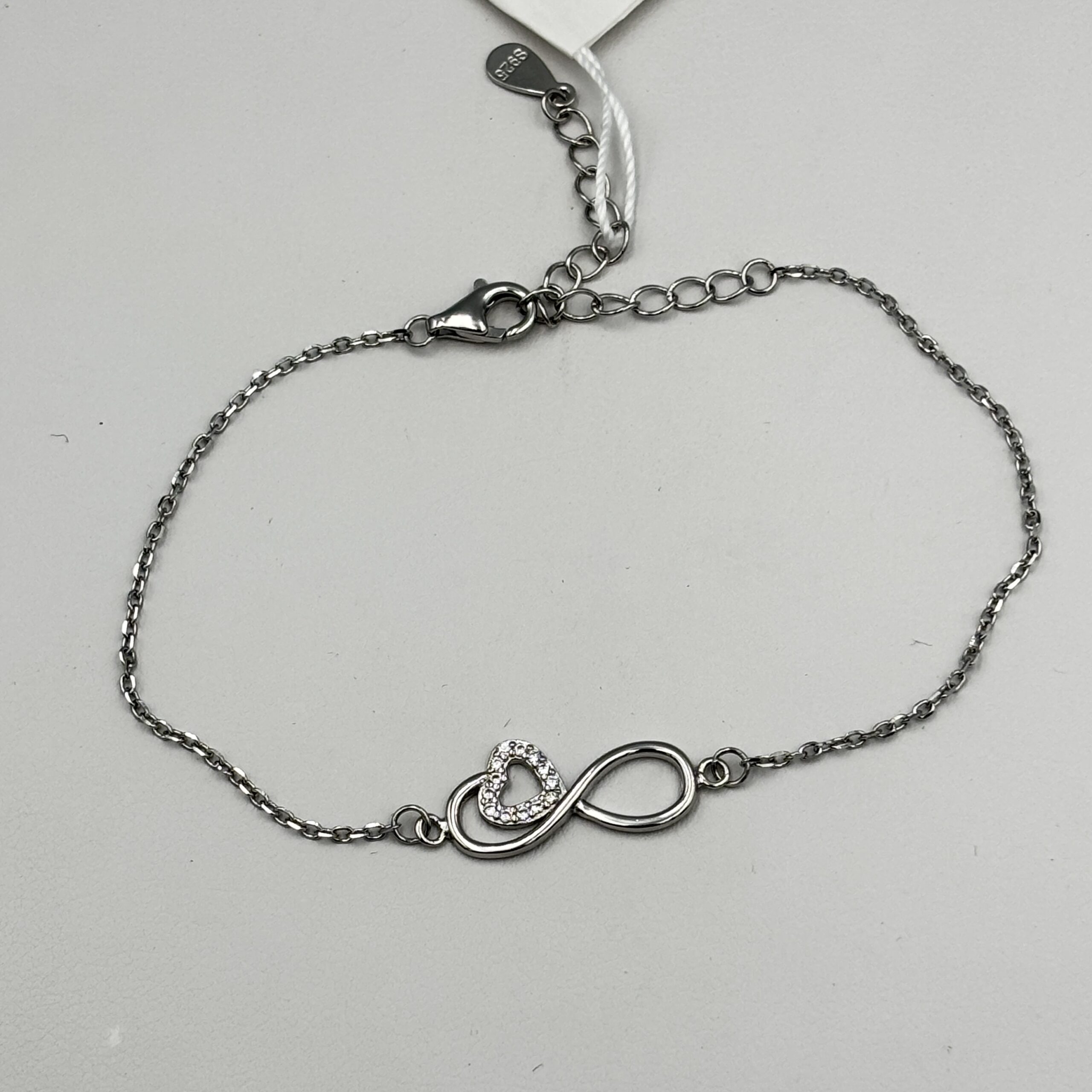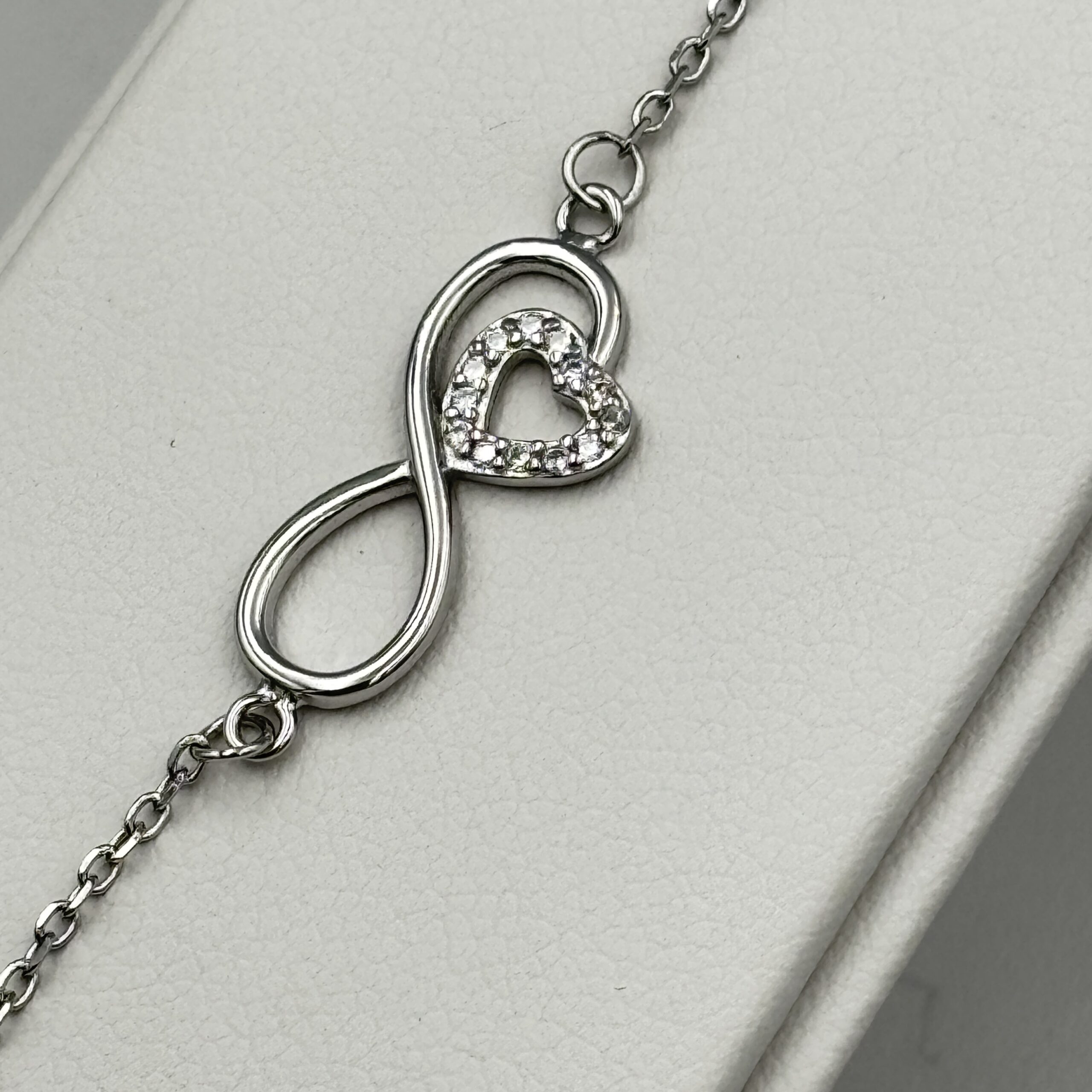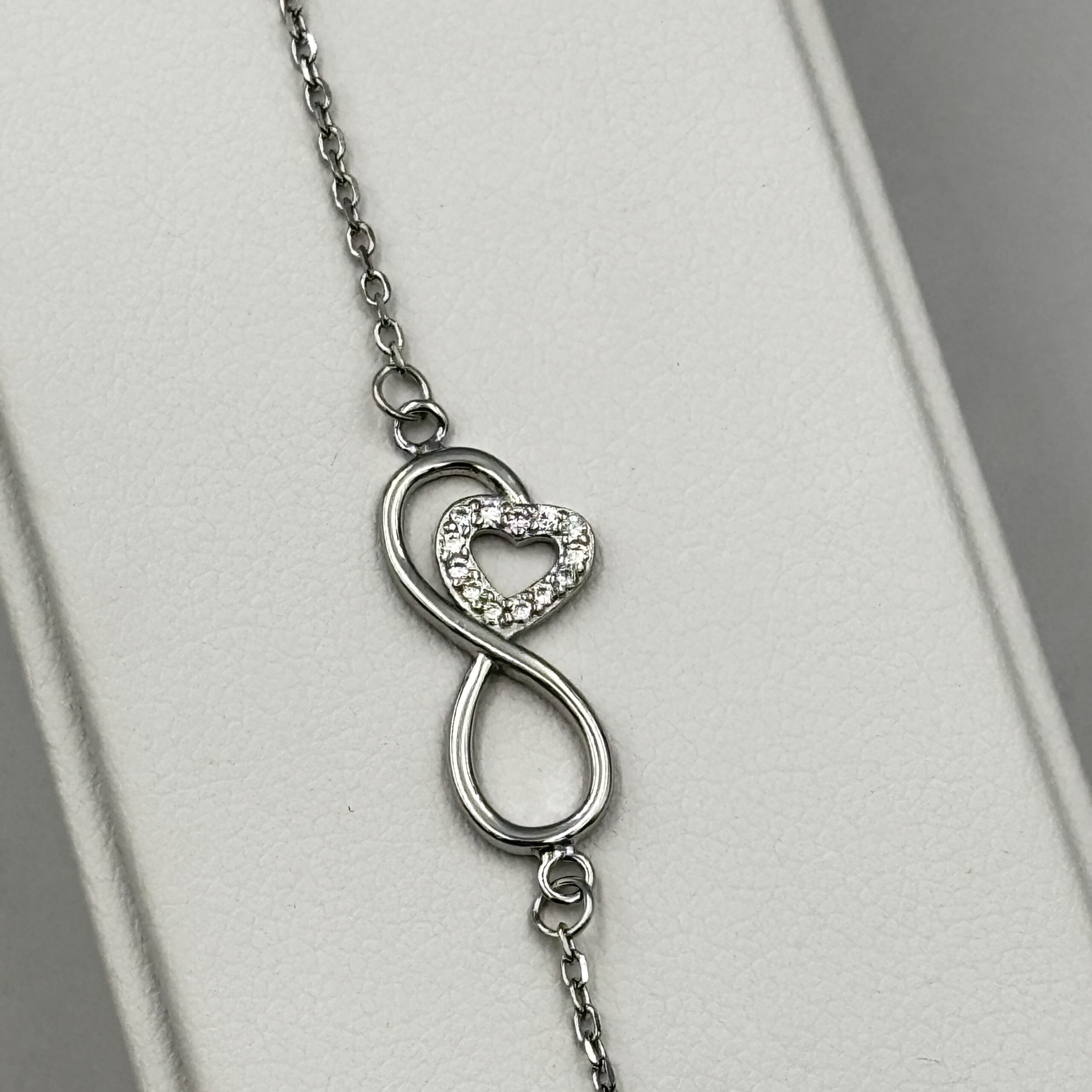 Doskonała propozycja na każdą okazję. Na delikatnym łańcuszku zawieszony jest misterny element  w kształcie nieskończoności, w którego centrum znajduje się urocze serduszko zdobione błyszczącymi cyrkoniami.