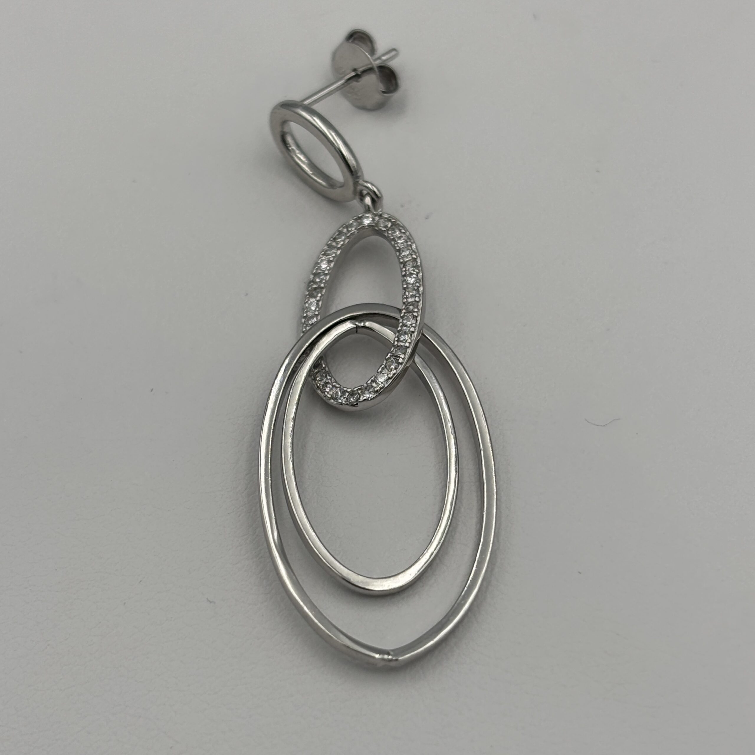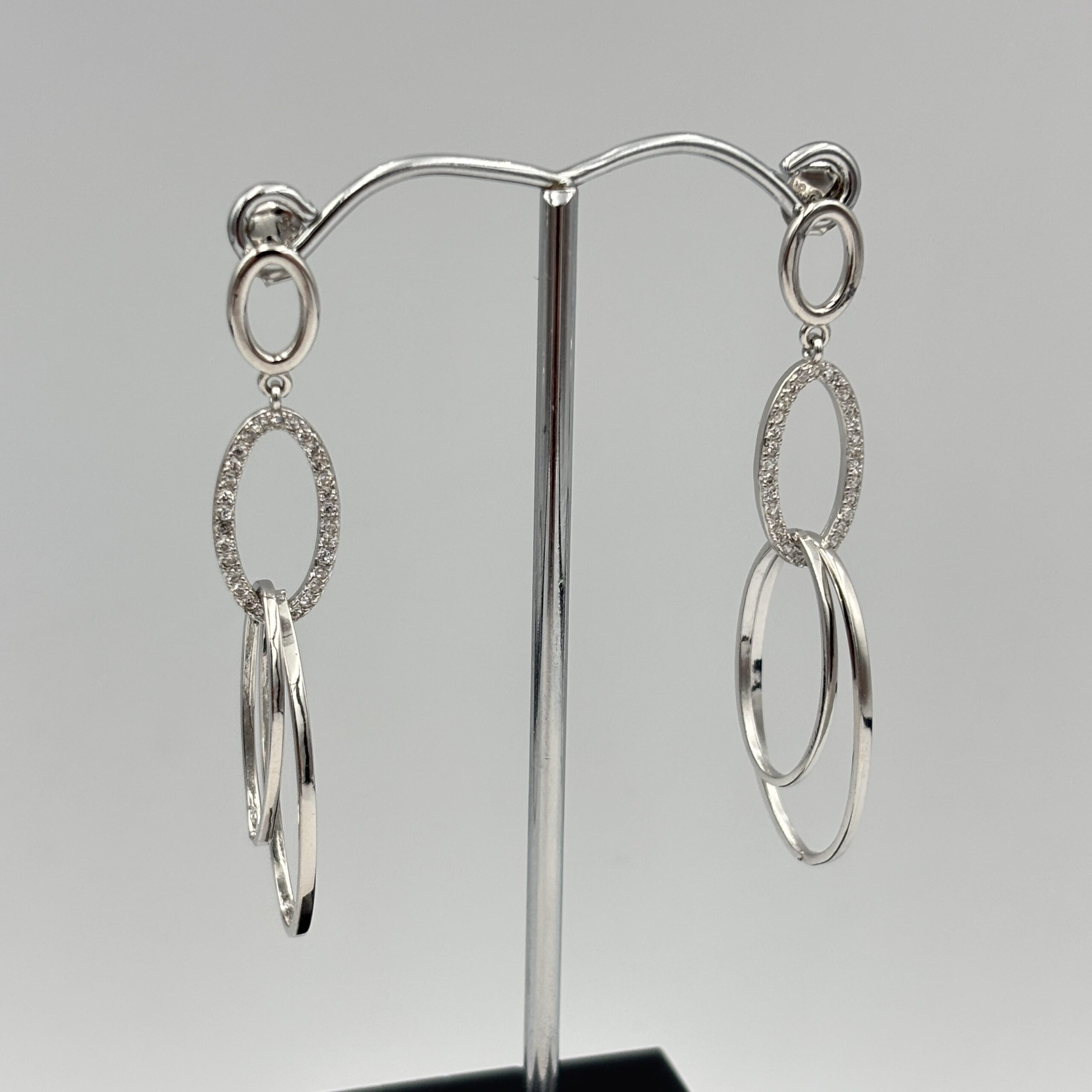 Stylowe kolczyki wykonane ze srebra próby 925, łączą w sobie klasyczną formę z nowoczesnym akcentem. Trzy połączone owalne pierścienie, z czego jeden zdobiony lśniącymi cyrkoniami, tworzą lekki, a zarazem efektowny dodatek do każdej stylizacji.
