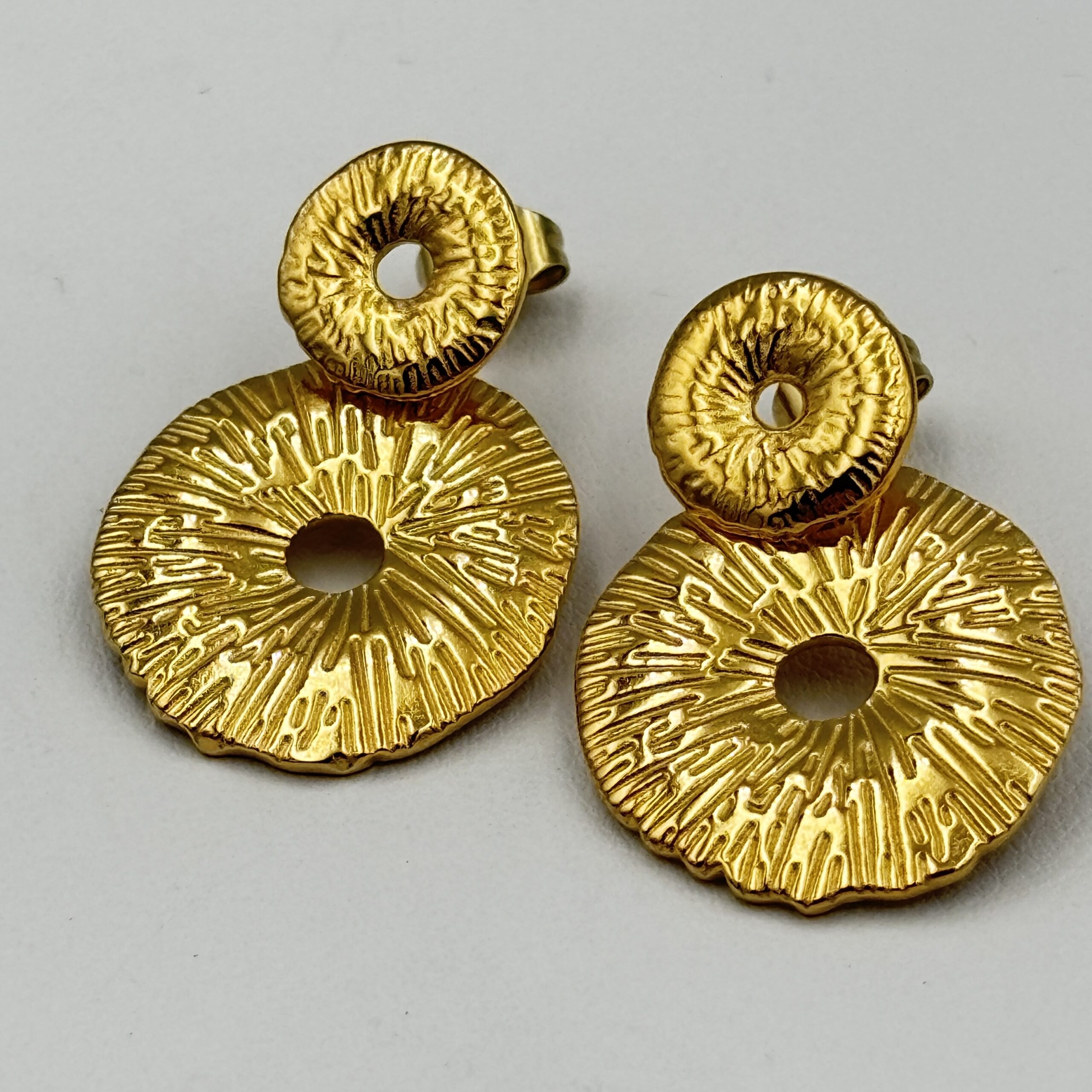 Dodaj odrobinę artystycznego wyrazu do swojej stylizacji dzięki tym wyjątkowym kolczykom ze stali nierdzewnej. Model składa się z dwóch złotych elementów w kształcie nieregularnych, fakturowanych kółek o wyraźnej, promienistej strukturze. Światło pięknie odbija się od powierzchni, tworząc elegancki, a zarazem surowy efekt.