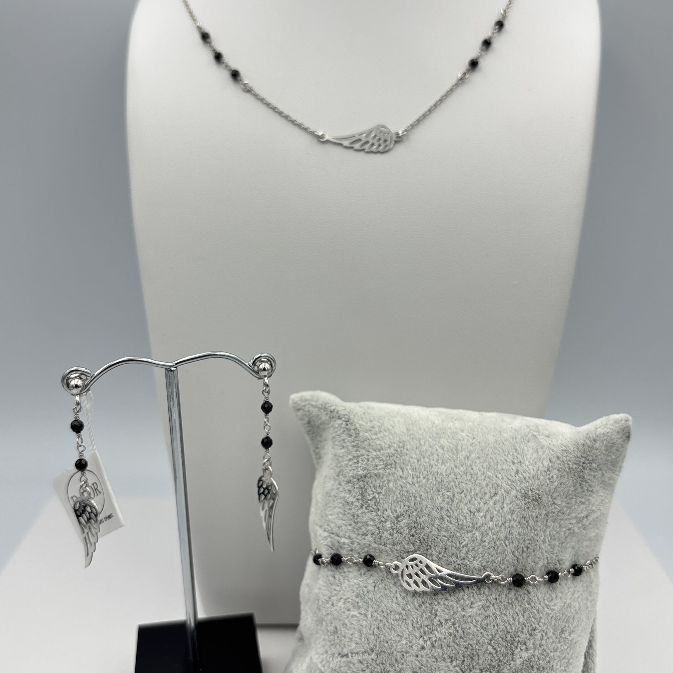 Komplet srebrnej biżuterii z motywem skrzydeł – naszyjnik, kolczyki i bransoletka