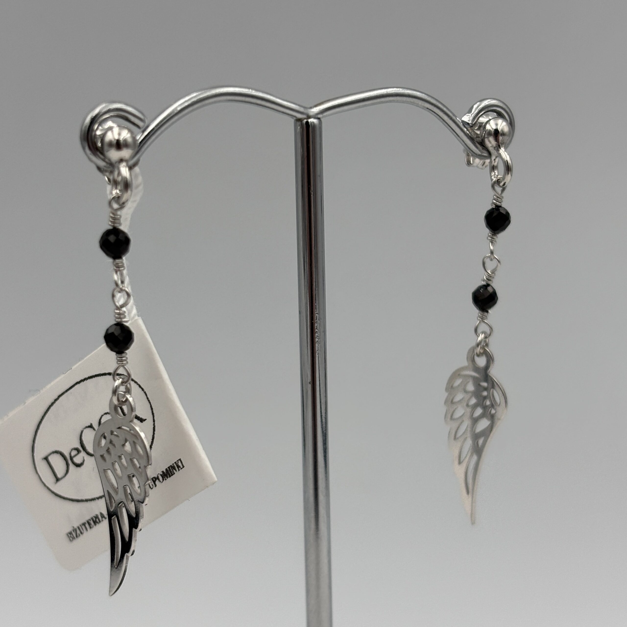 •Kolczyki wiszące, ozdobione drobnymi koralikami i skrzydełkami, które pięknie poruszają się przy każdym ruchu. Wymiary 44×7 mm