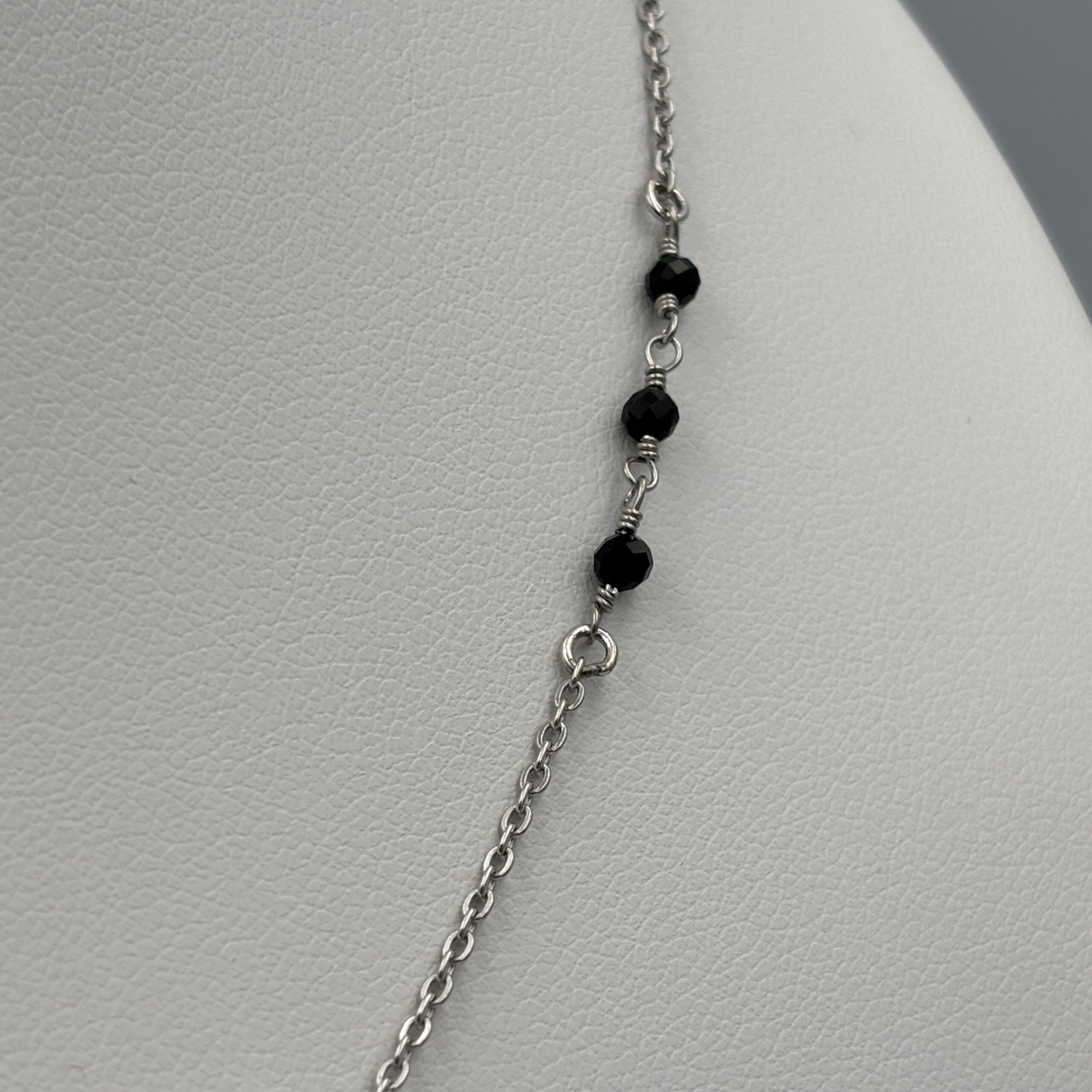 •Naszyjnik z ażurowym skrzydłem anioła i czarnymi koralikami rozmieszczonymi wzdłuż łańcuszka, regulowana długość 45-49 cm