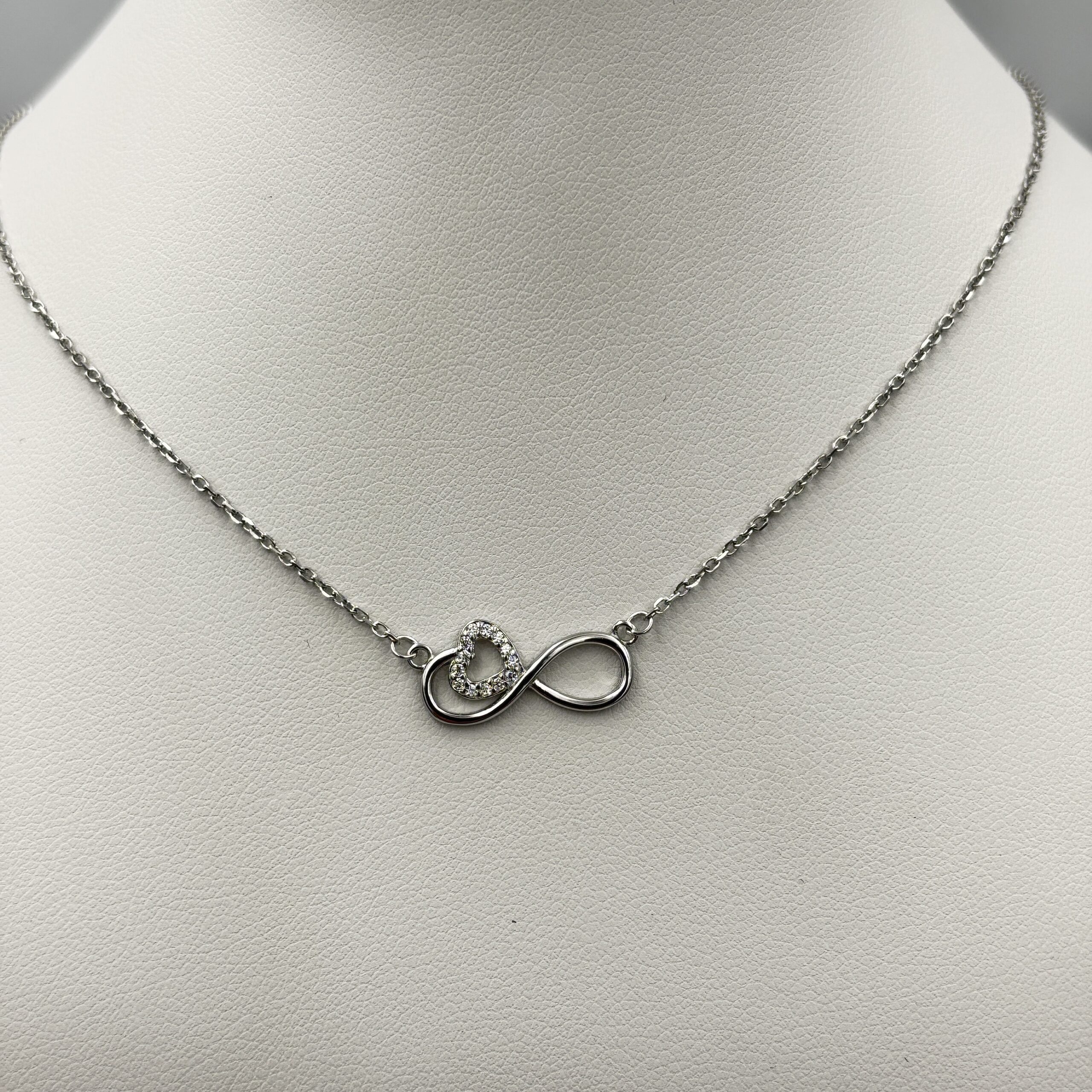 Srebro Ag925.Doskonała propozycja na każdą okazję. Na delikatnym łańcuszku zawieszony jest misterny wisior w kształcie nieskończoności, w którego centrum znajduje się urocze serduszko zdobione błyszczącymi cyrkoniami.