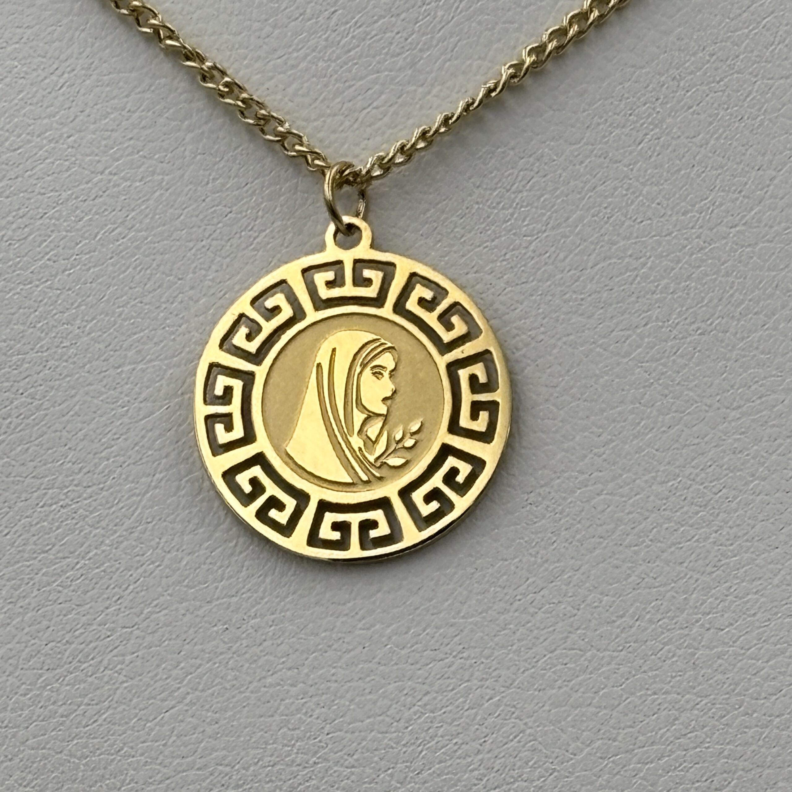 Elegancki łańcuszek ze stali chirurgicznej w kolorze złotym, ozdobiony wyjątkowym wisiorkiem  z subtelnym motywem Matki  Boskiej . To nie tylko biżuteria, ale także symbol miłości, opieki i duchowej więzi. Wisiorek o misternym, ażurowym wykończeniu pięknie odbija światło, dodając delikatnego blasku każdej stylizacji.