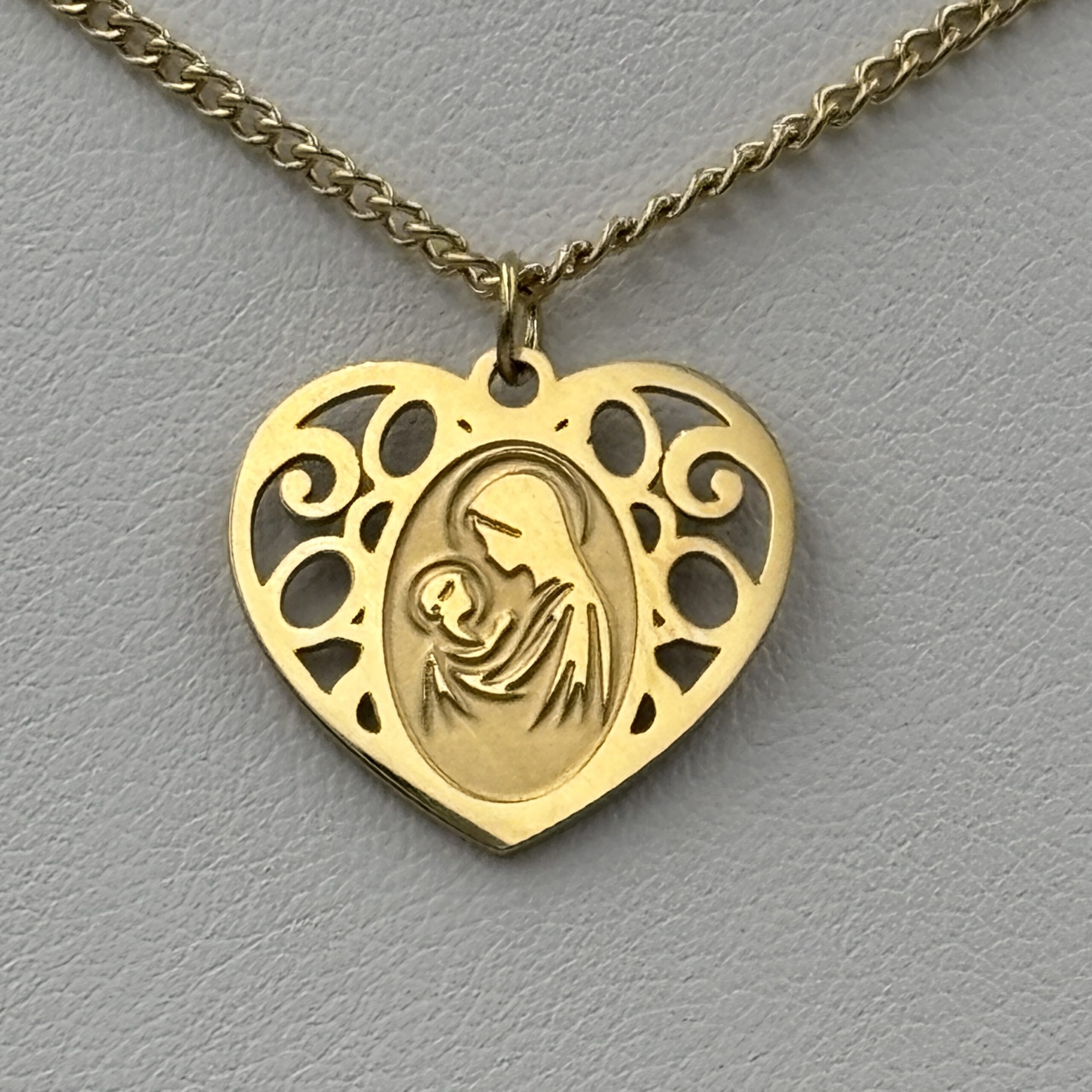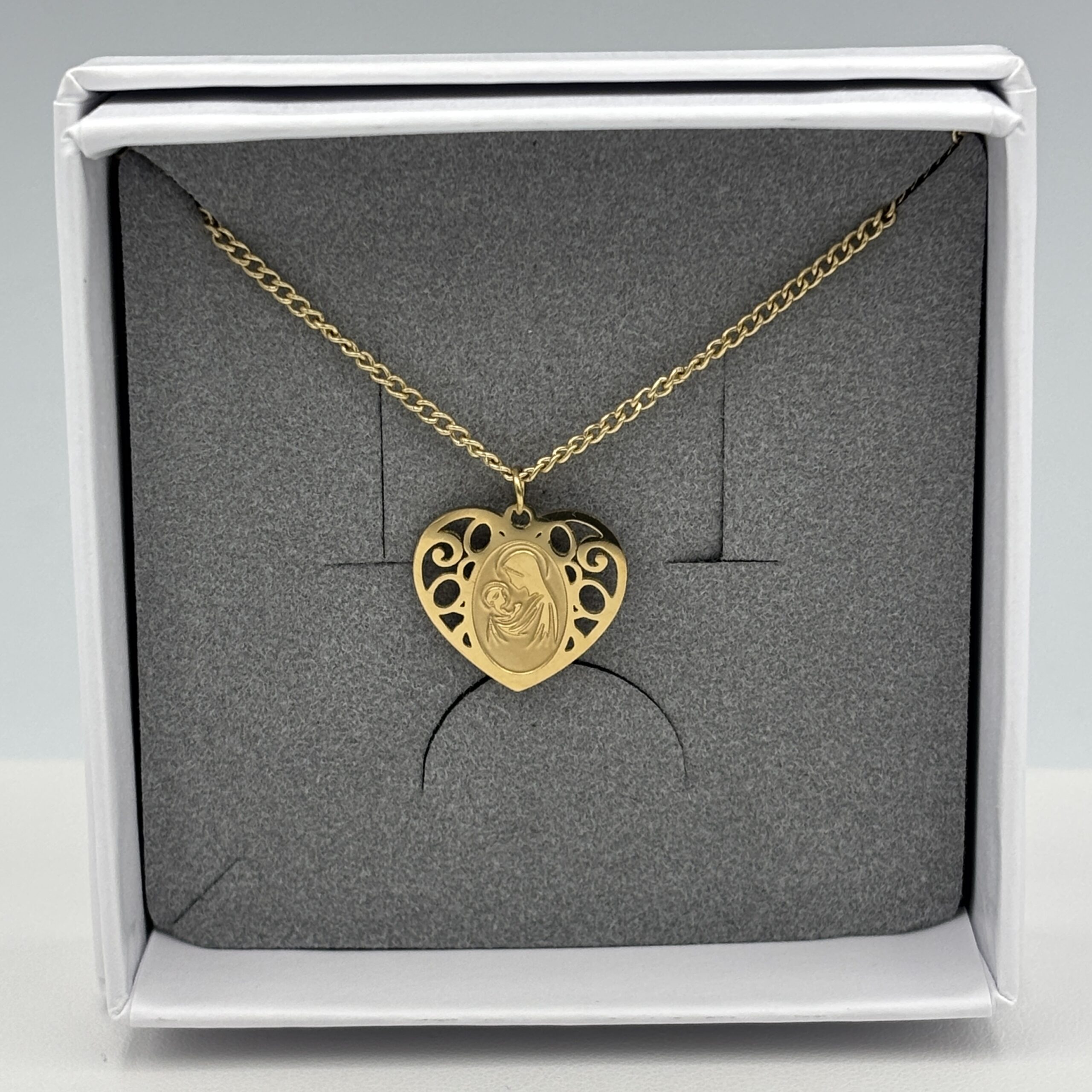 Elegancki łańcuszek ze stali chirurgicznej w kolorze złotym, ozdobiony wyjątkowym wisiorkiem w kształcie serca z subtelnym motywem Matki Boskiej  z Dzieciątkiem. To nie tylko biżuteria, ale także symbol miłości, opieki i duchowej więzi. Wisiorek o misternym, ażurowym wykończeniu pięknie odbija światło, dodając delikatnego blasku każdej stylizacji.